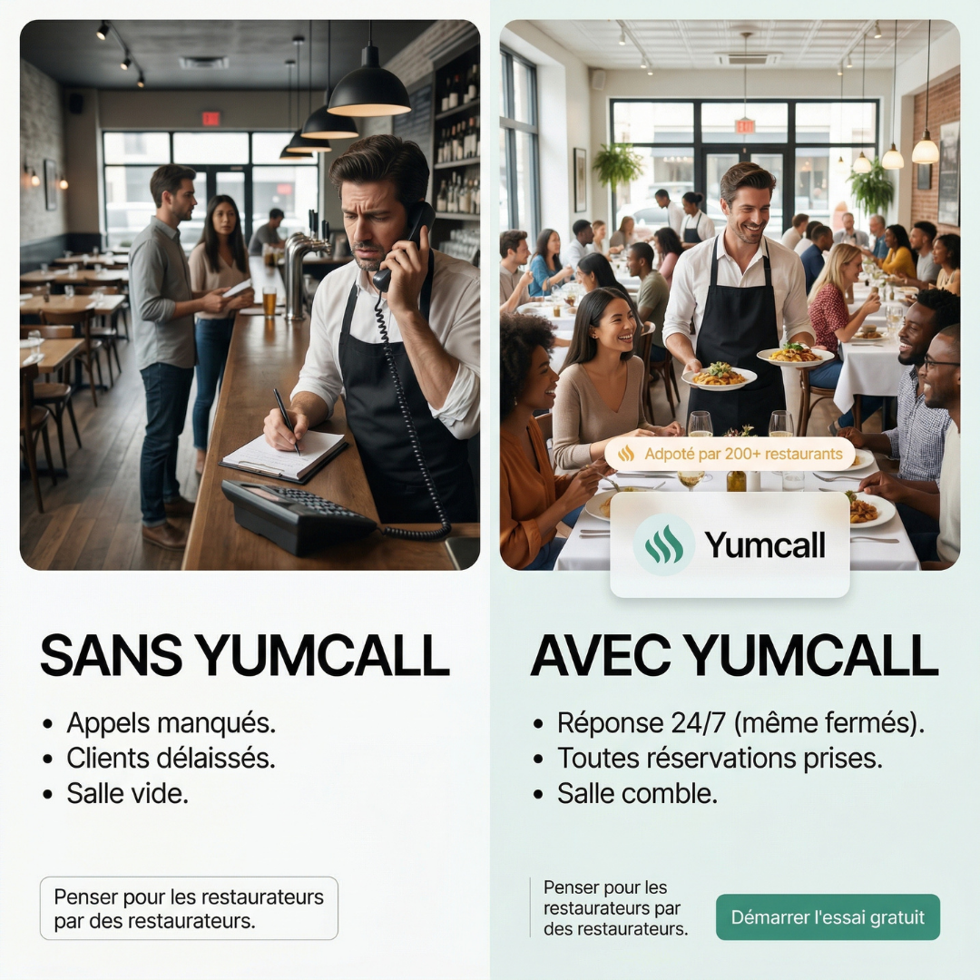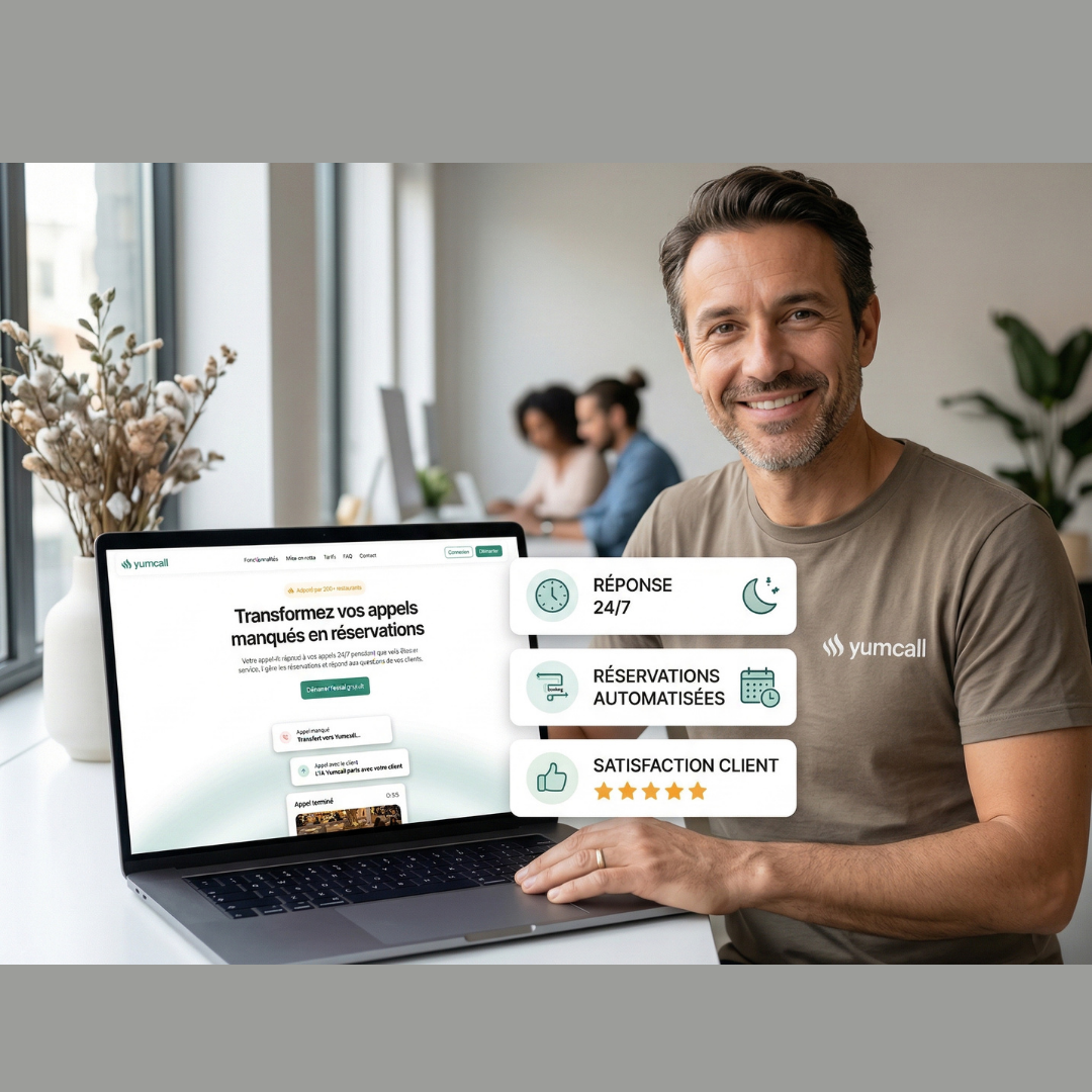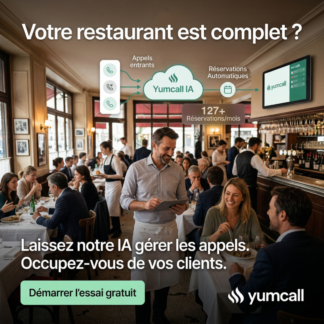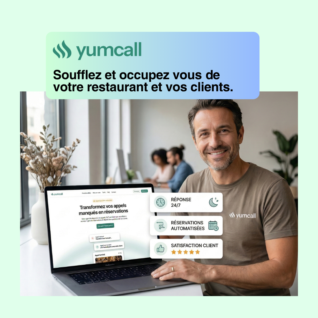 Yumcall est une plateforme SaaS d'agent vocal IA conçue pour les restaurateurs. Notre solution gère automatiquement les appels entrants des restaurants : réservations, modifications, annulations, questions fréquentes, 24h/24, 7j/7, avec une voix naturelle en français. Fini les appels manqués en plein service, fini le téléphone qui sonne dans le vide. Le restaurateur garde le contrôle via un tableau de bord simple et intuitif.